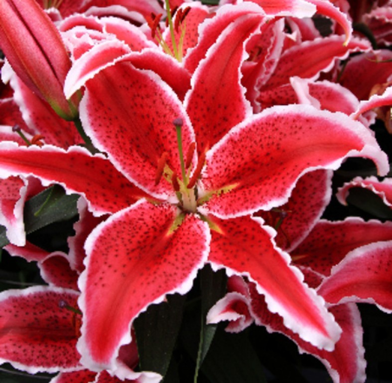 Окраска цветка : ярко-малиновый с темным крапом и белой каймой по краям